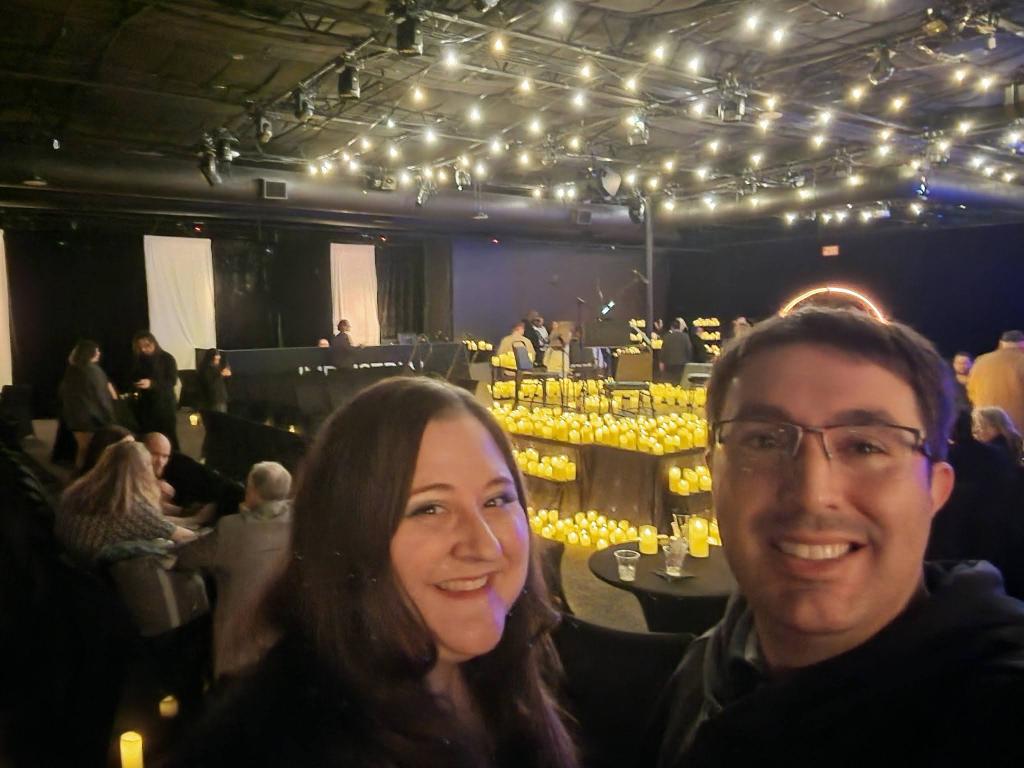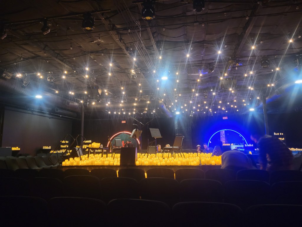 Nothing says Las Vegas like a venue in the downtown industrial village behind the strip. This is the small location that they set up for the show. You enter into a candle lit space front and center there is the stage. This space was maybe for 200 ish people. mostly row seating but there were some table options for special tickets I would assume. They also offered a few drink choices.